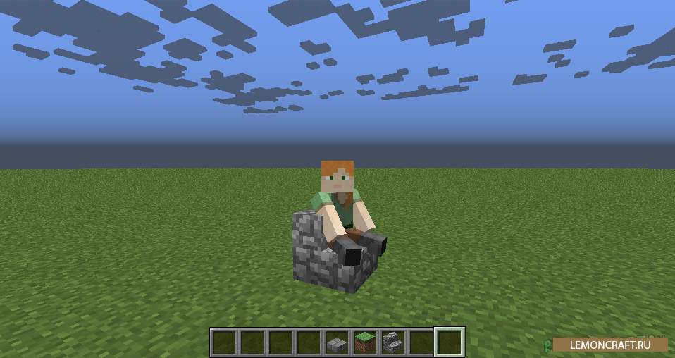 Мод Sit позволяет вашему персонажу сидеть на лестницах и полу блоках. Для того, что бы сесть достаточно навести курсор на ту же лестницу и нажать ПКМ - все игрок сидит. Данный мод поддерживает лестницы и плиты из других модов и позволяет вашей фантазии немного поиграть.